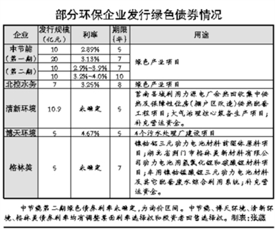 近一年來,綠色債券在我國債券市場上表現(xiàn)搶眼,成為企業(yè)特別是環(huán)保企業(yè)有力的融資工具。今年8月,北控水務(wù)集團(tuán)有限公司(以下簡稱“北控水務(wù)”)發(fā)行綠色熊貓債;隨后,博天環(huán)境集團(tuán)有限公司(以下簡稱“博天環(huán)境”)、北京清新環(huán)境技術(shù)股份有限公司(以下簡稱“清新環(huán)境”)、中國節(jié)能環(huán)保集團(tuán)公司(以下簡稱“中節(jié)能”)等環(huán)保企業(yè),都陸續(xù)獲批發(fā)行綠色債券。